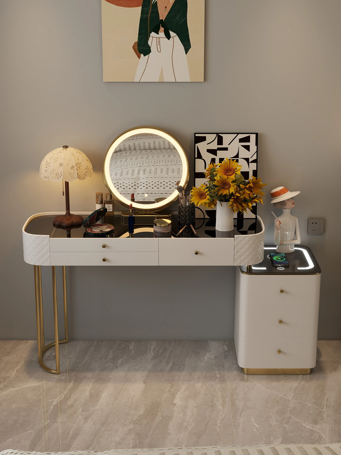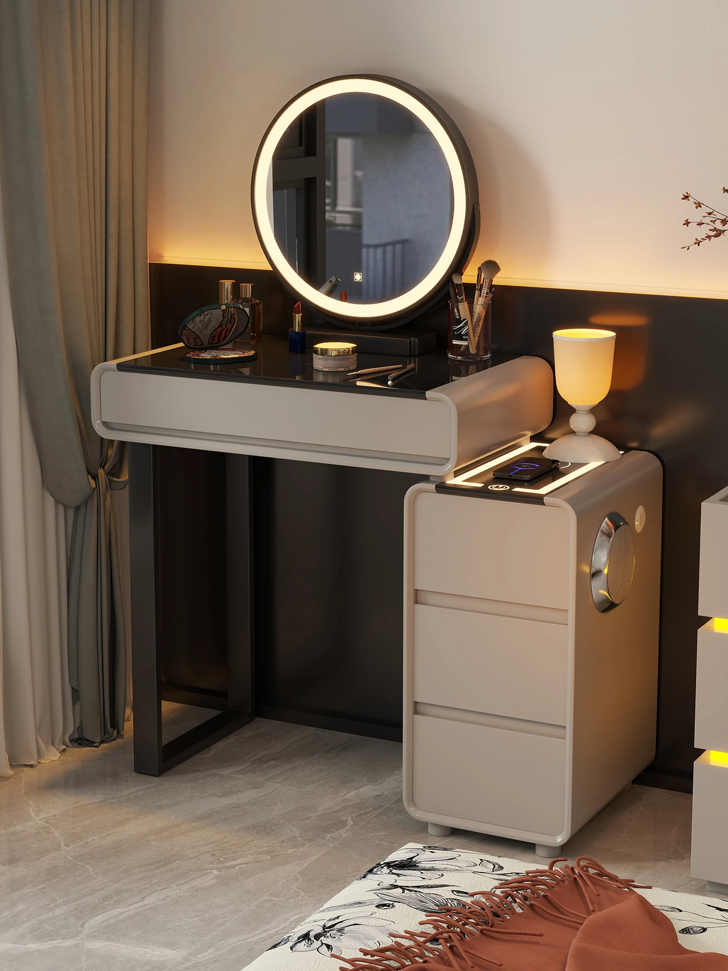 Modern Smart Vanity Table with Bluetooth Charging - Elegant Makeup Storage Cabinet and Glass Dressing Desk for Your Bedroom