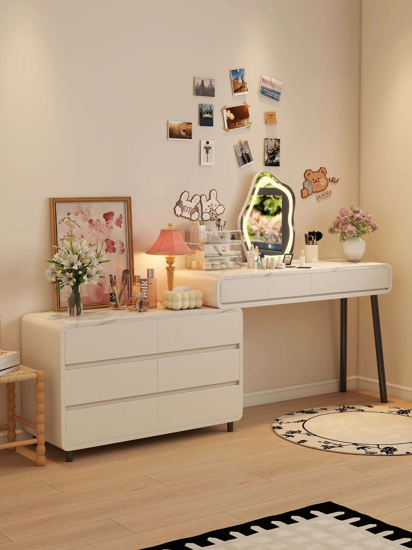 French Cream Vanity Table - Multi-Functional Makeup Desk with Modern Minimalist Design, Perfect for Bedrooms, Combines Dressing Table, Chest of Drawers, and Writing Desk in One