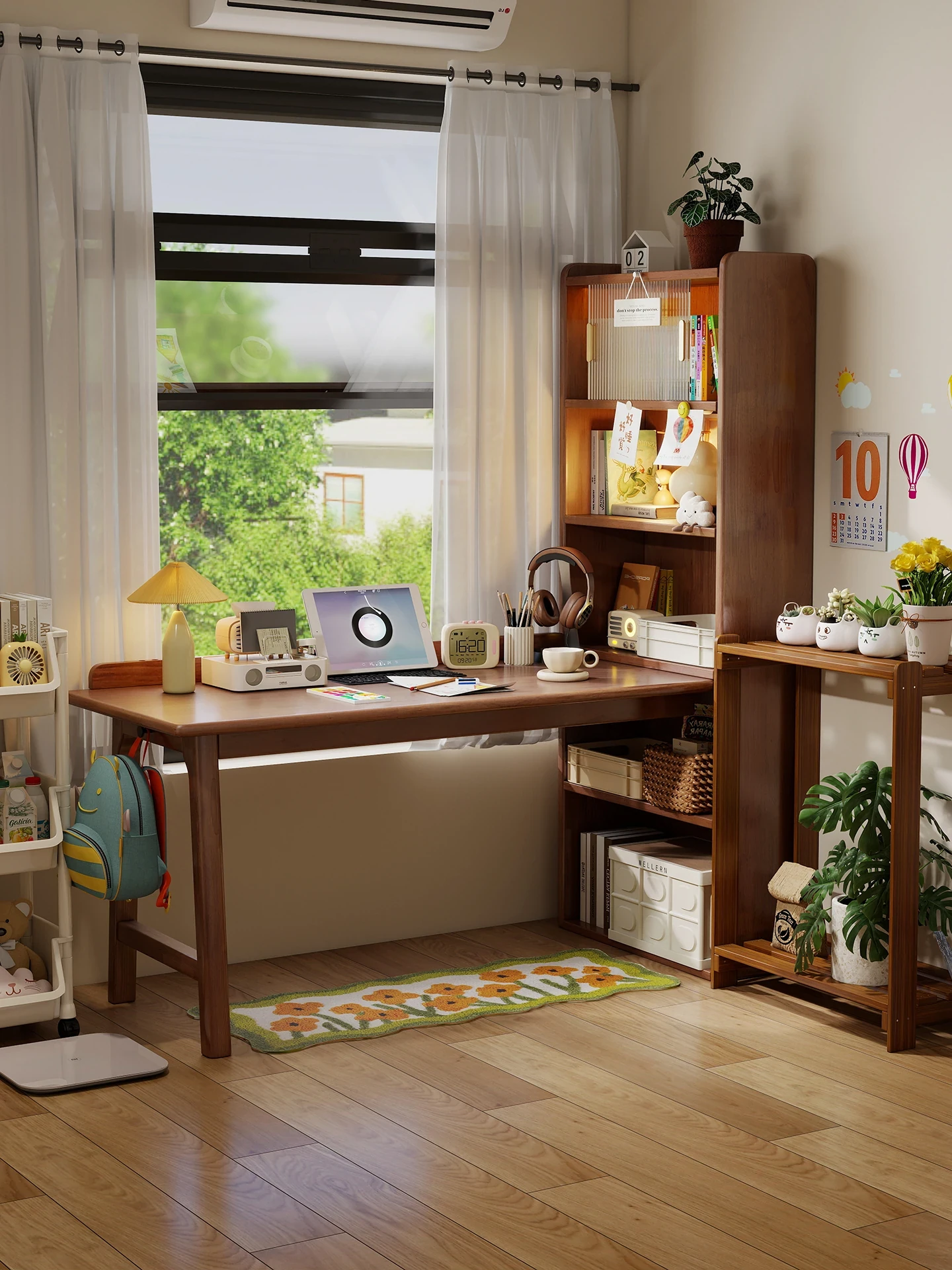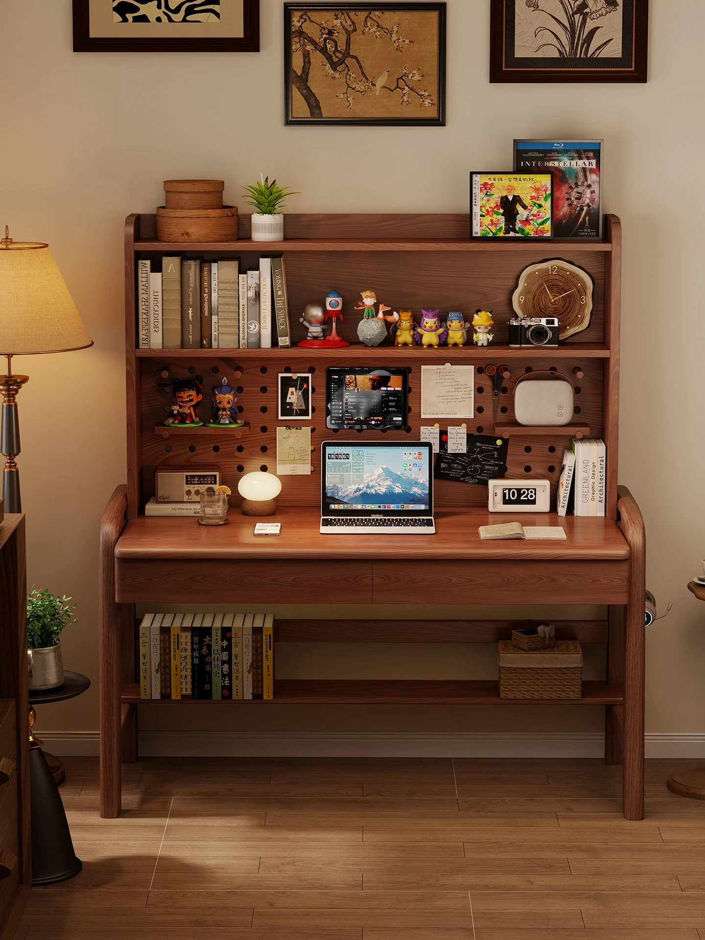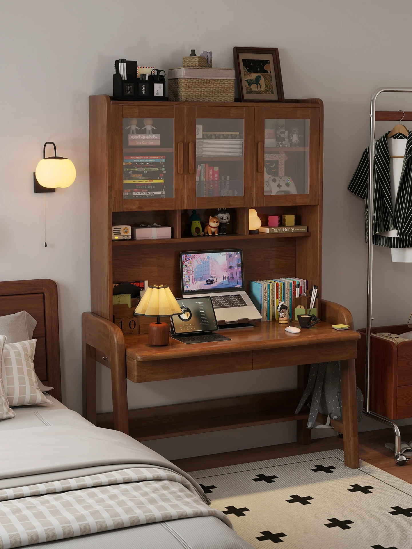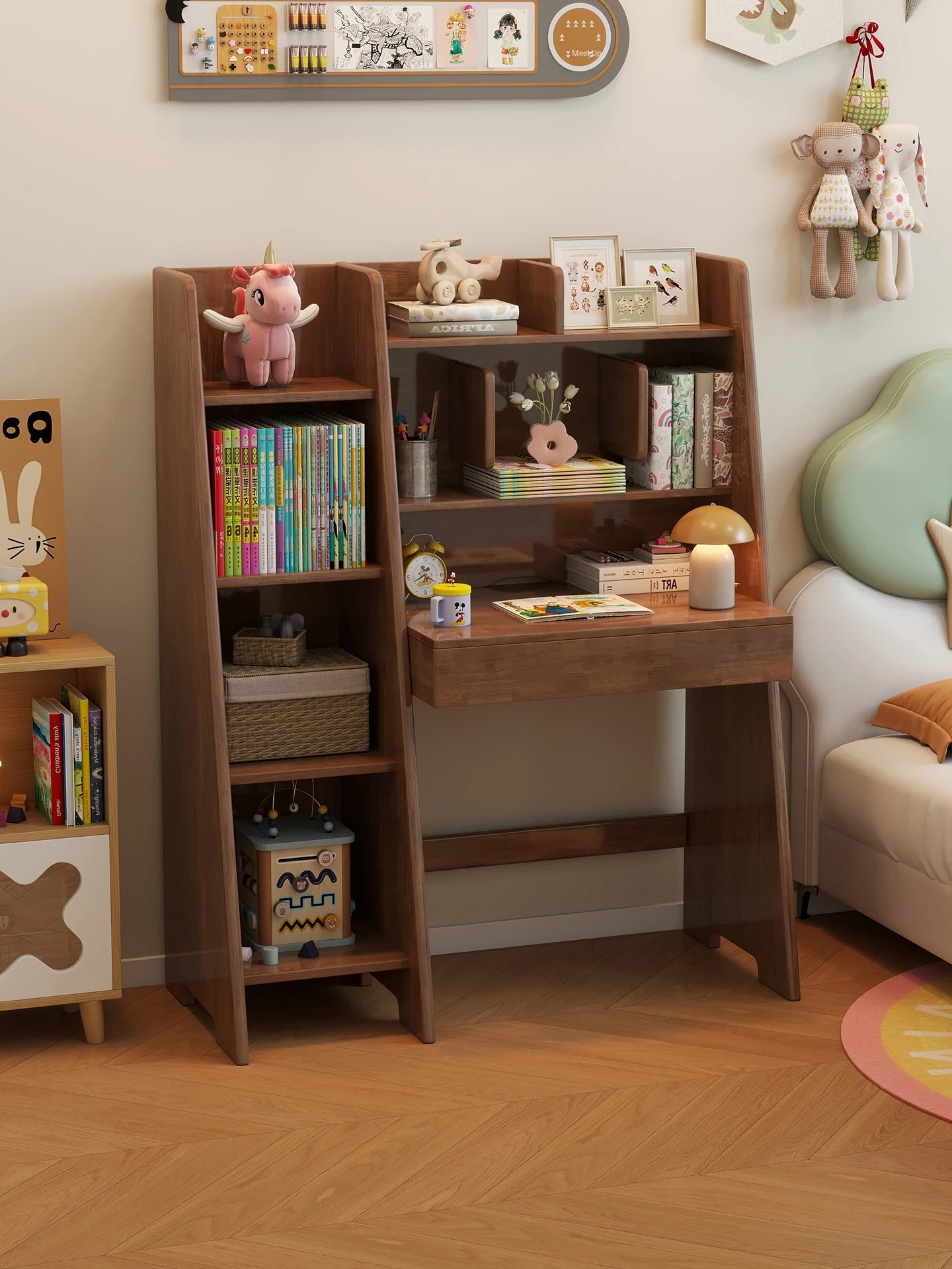 Multi-Functional Solid Wood Desk with Bookshelf - Adjustable Children's Study Table for Small Spaces, Perfect for Home Office and Desktop Computers.