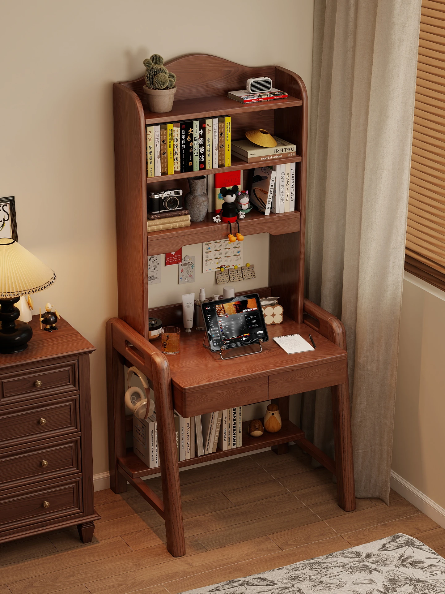 Vintage Solid Wood Desk with Bookshelf - Versatile Study Table for Home and Bedroom, Adjustable Height Design for Students and Professionals, Minimalist Style Computer Desk