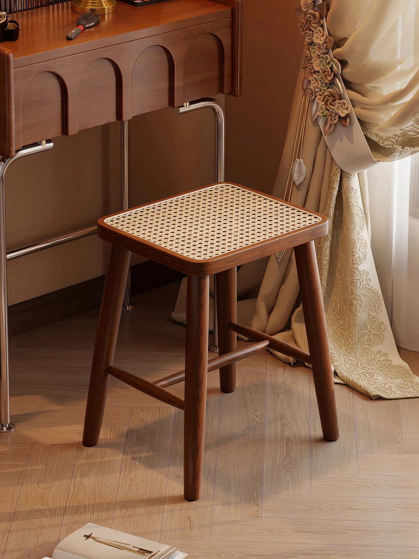 Vintage Solid Wood Rattan Makeup Stool - Durable and Sturdy Dressing Chair for Bedroom and Home Use, Perfect for Your Makeup Routine