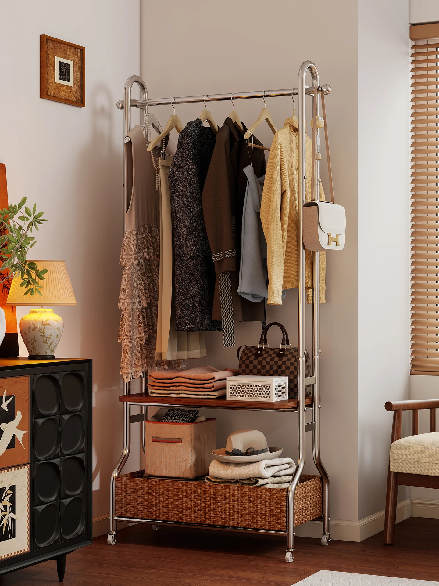 Portable Vintage Style Clothes Rack with Integrated Laundry Basket - Minimalist Rattan Design for Bedroom Use