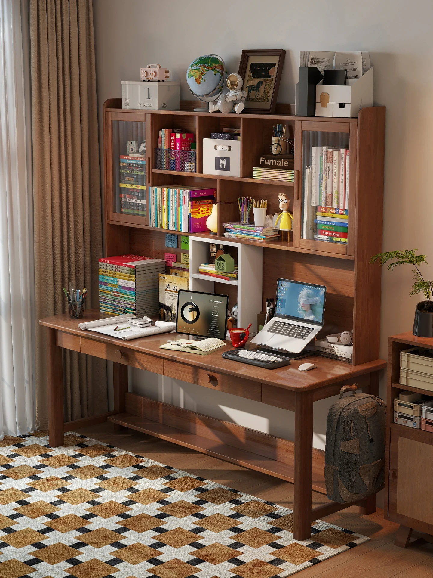Solid Wood Double Desk and Bookshelf Combo - Minimalist Home Office Computer Desk for Bedroom, Ideal for Children's Study and Writing Needs