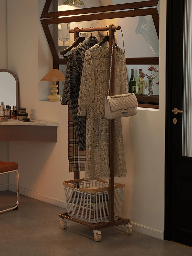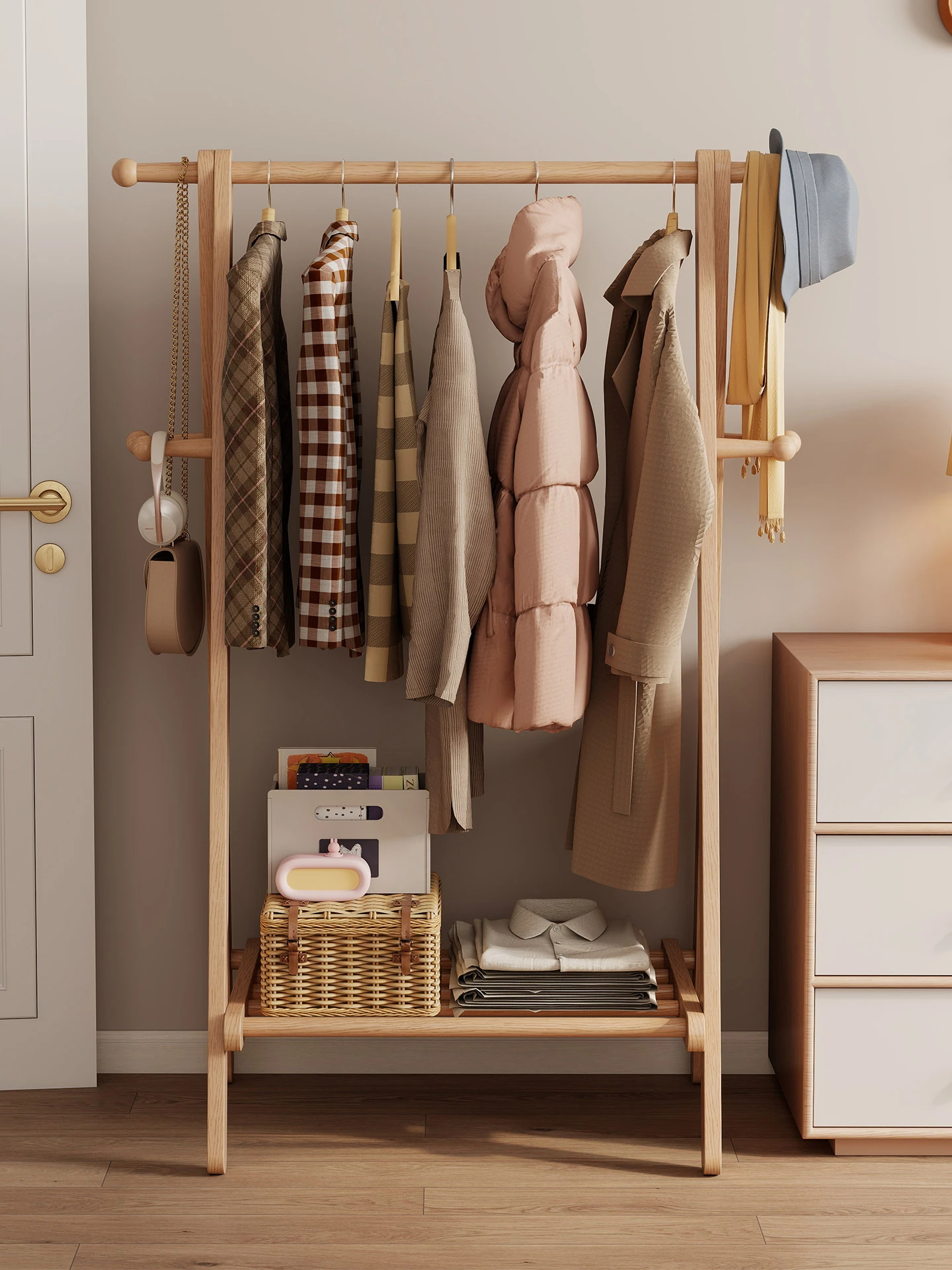 Multi-Functional Wooden Clothing Rack - Portable Floor Hanger for Bedroom, Bedside Coat Stand with Laundry Basket and Storage Organizer, Ideal for Home Use