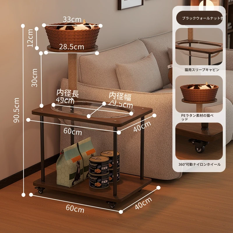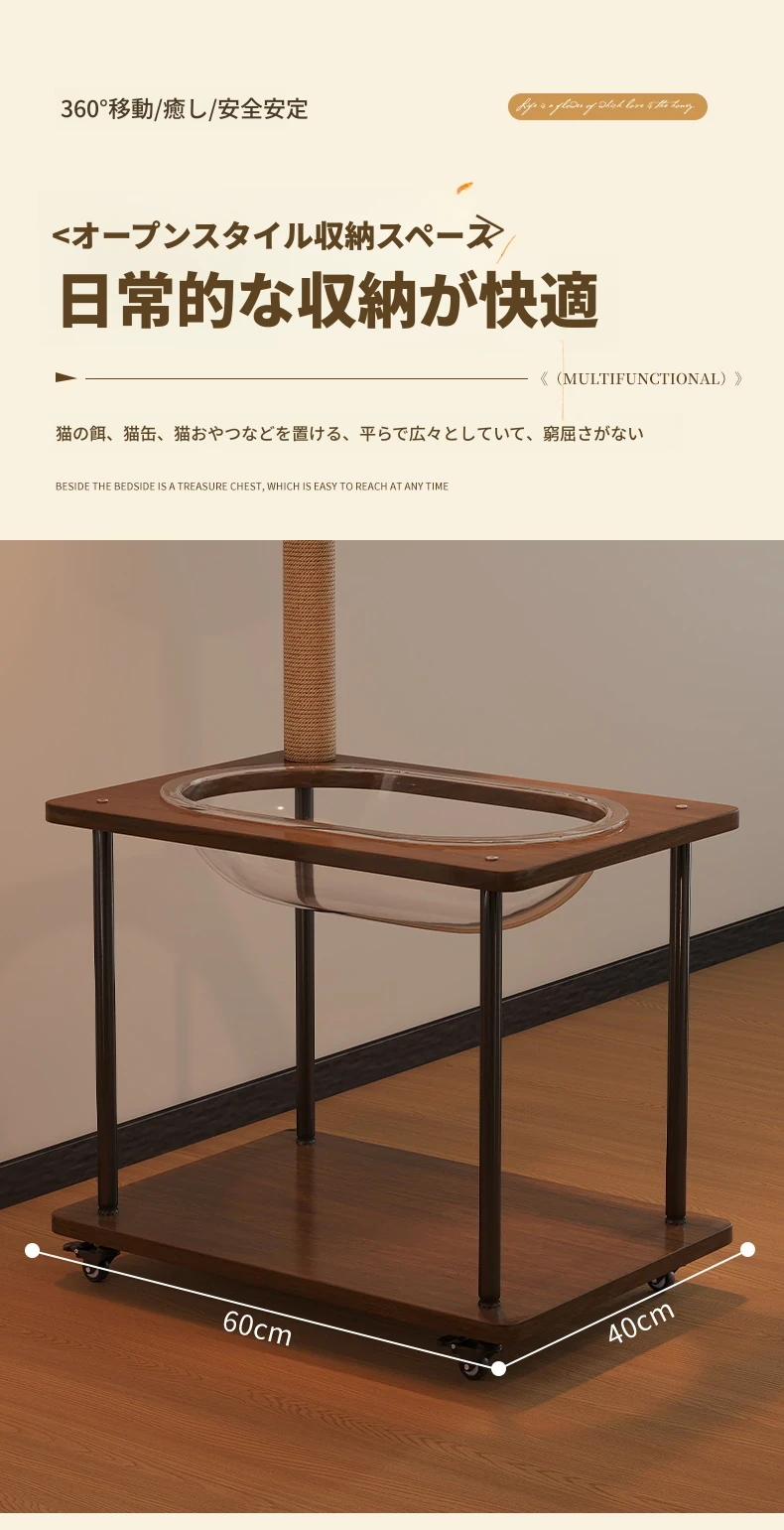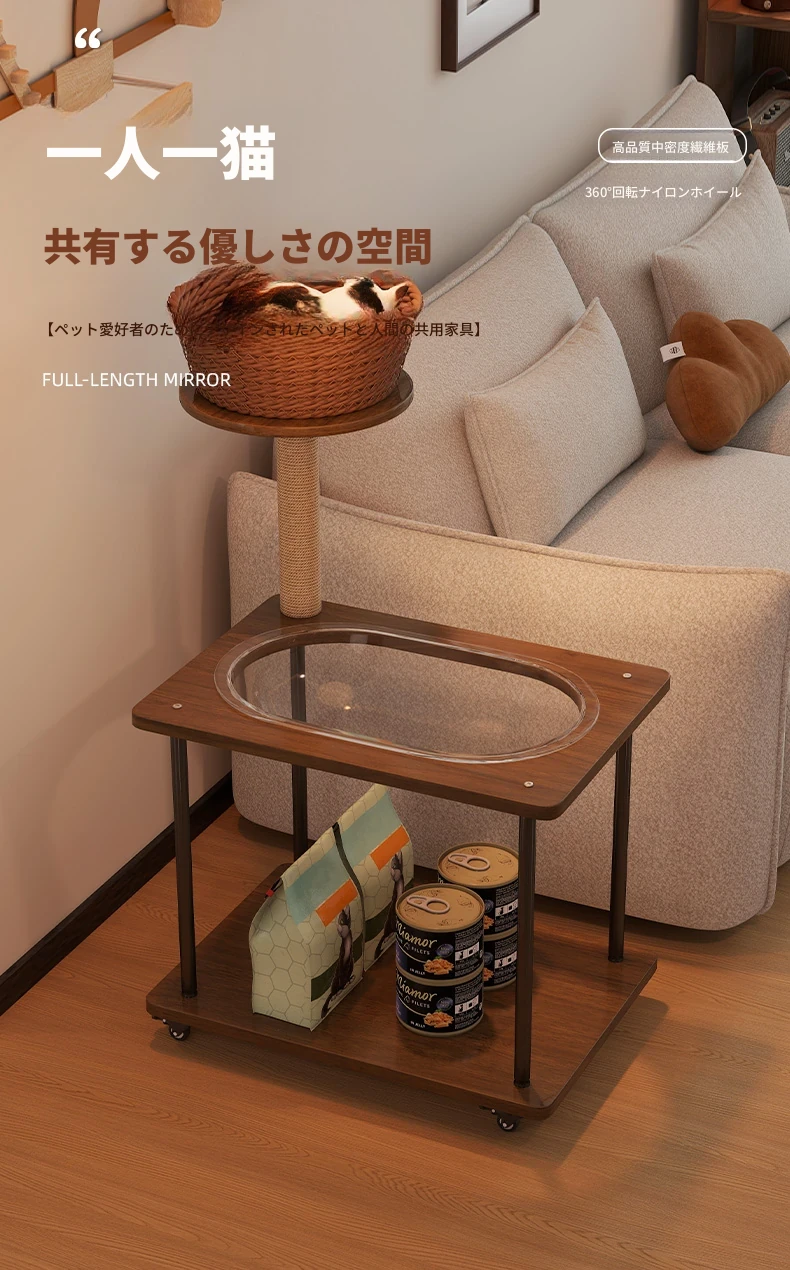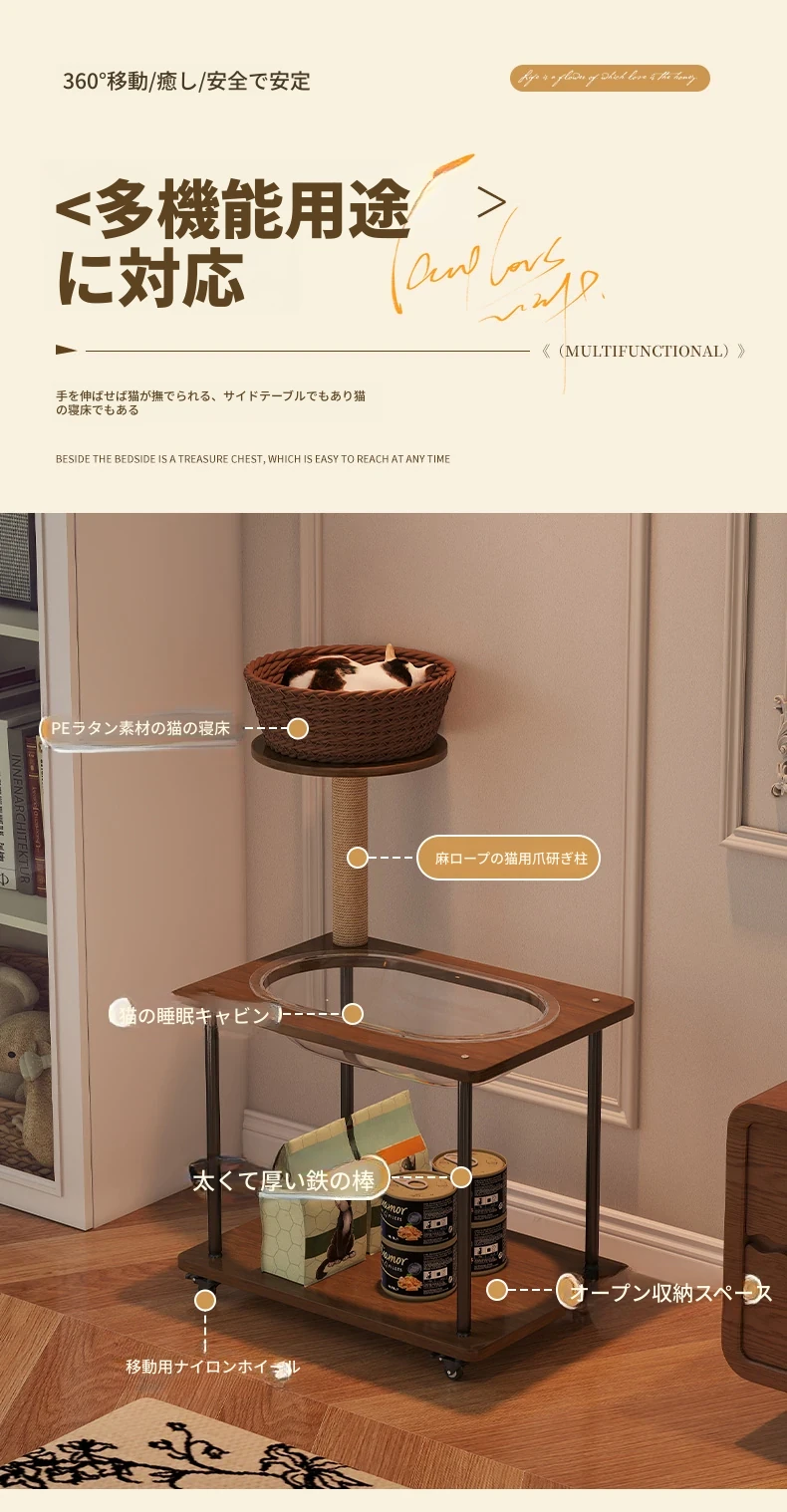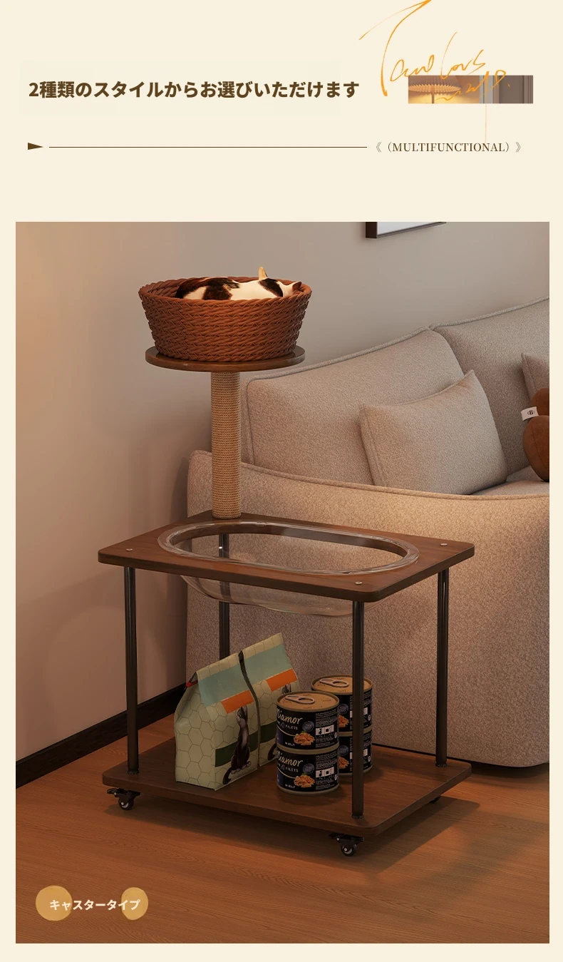 ペットと一緒に使える!コンパクトなサイドテーブル&キャットタワーがセットになった多機能キャットハウス。移動可能なキャビネット付きで、小スペースでも大活躍!猫ちゃんとの楽しい時間をお届けします。