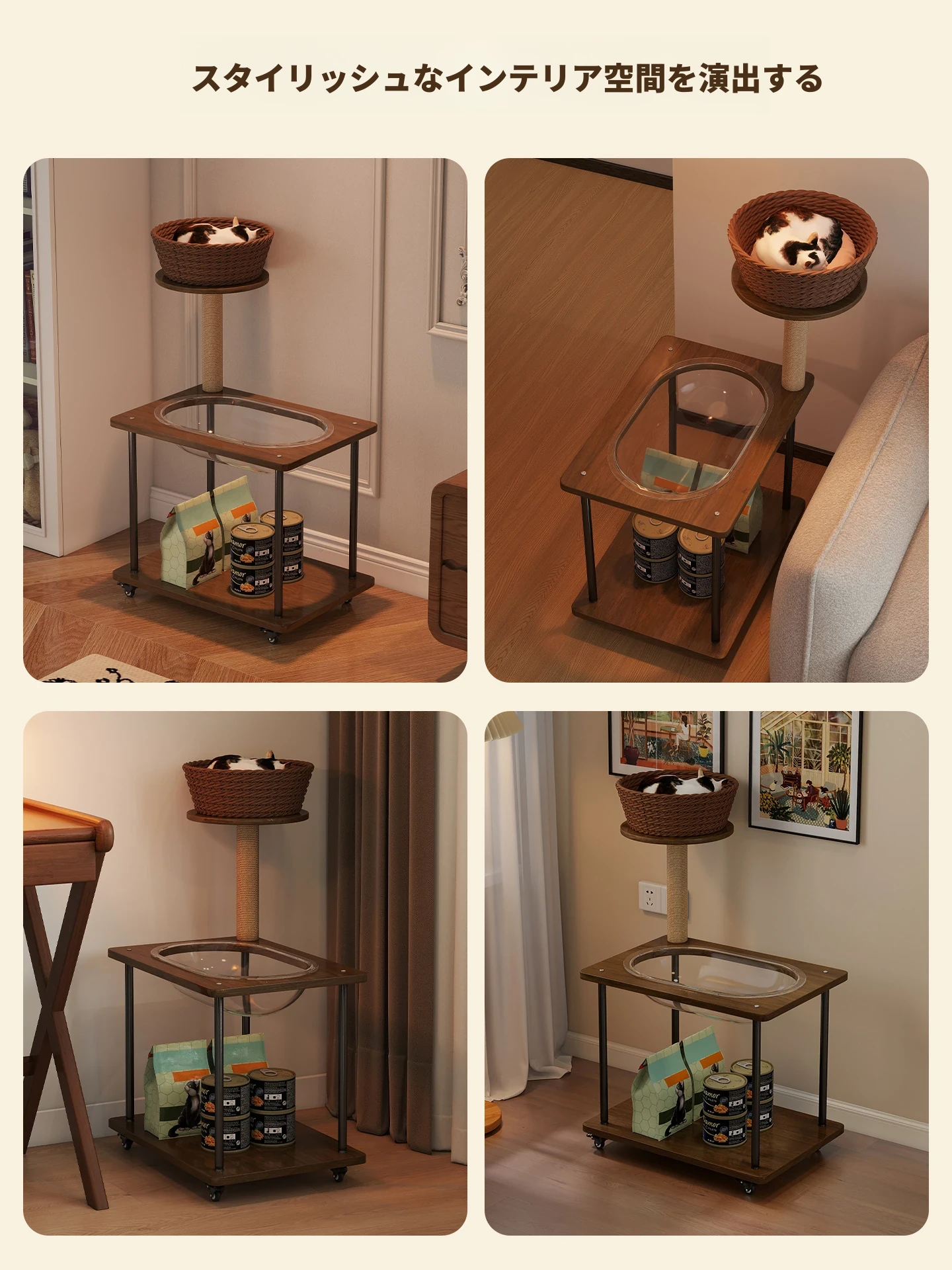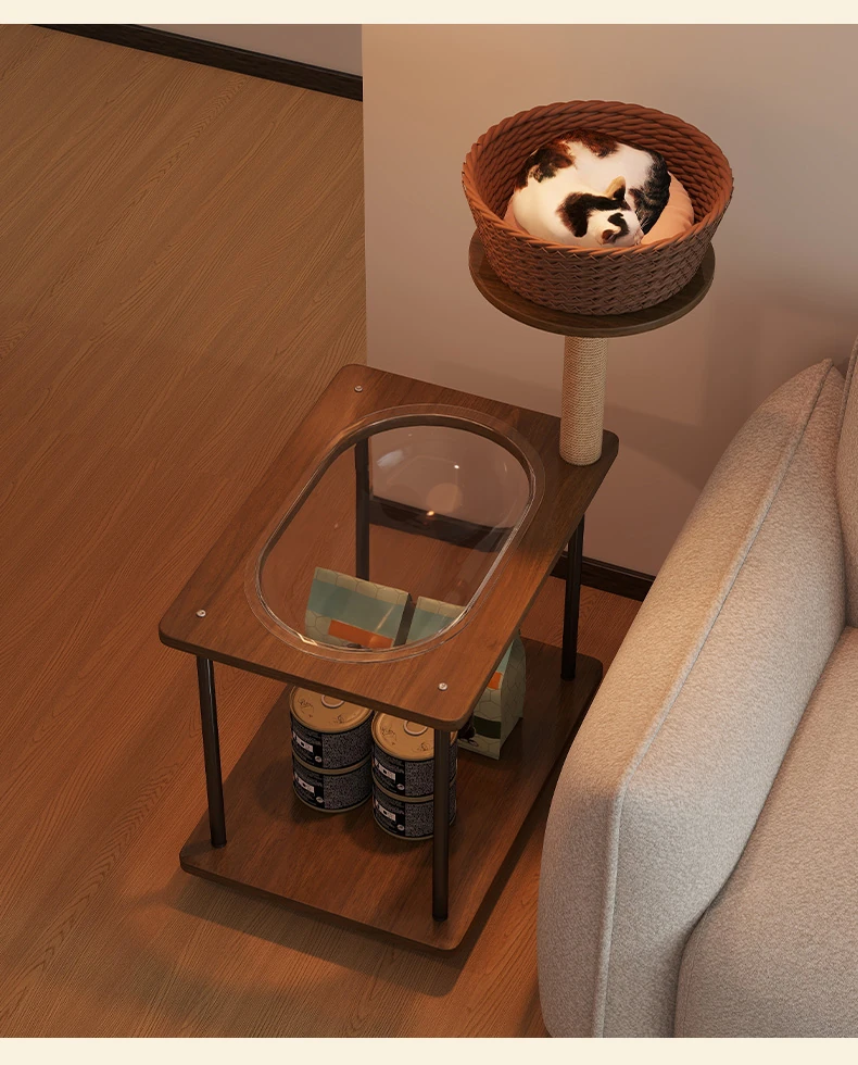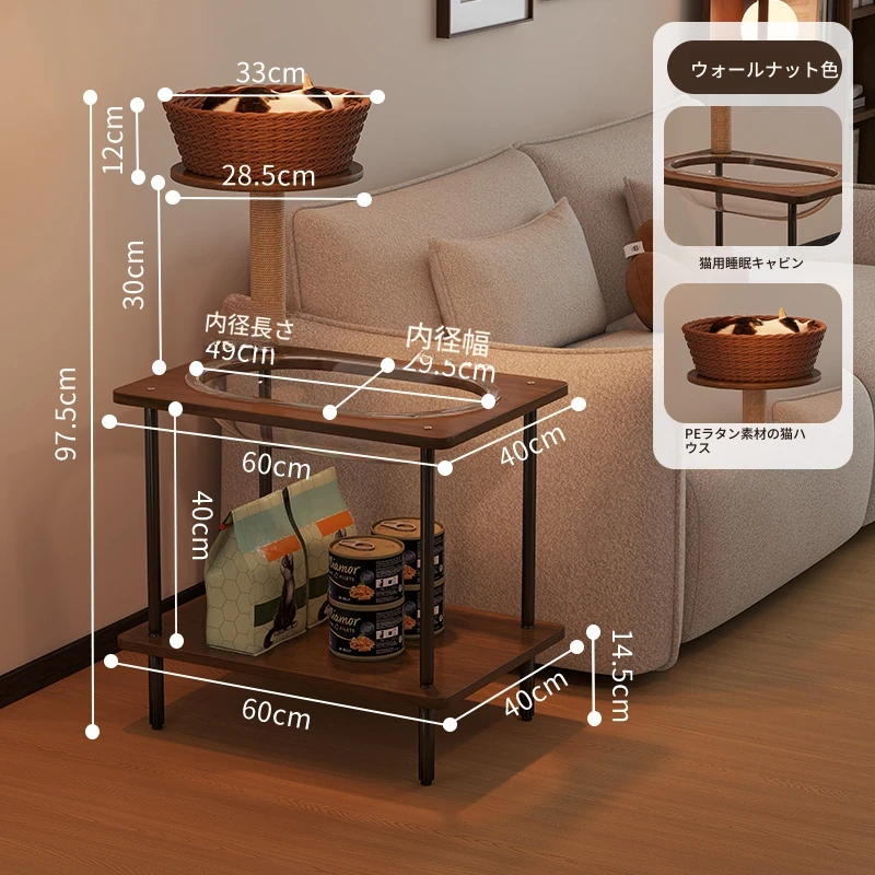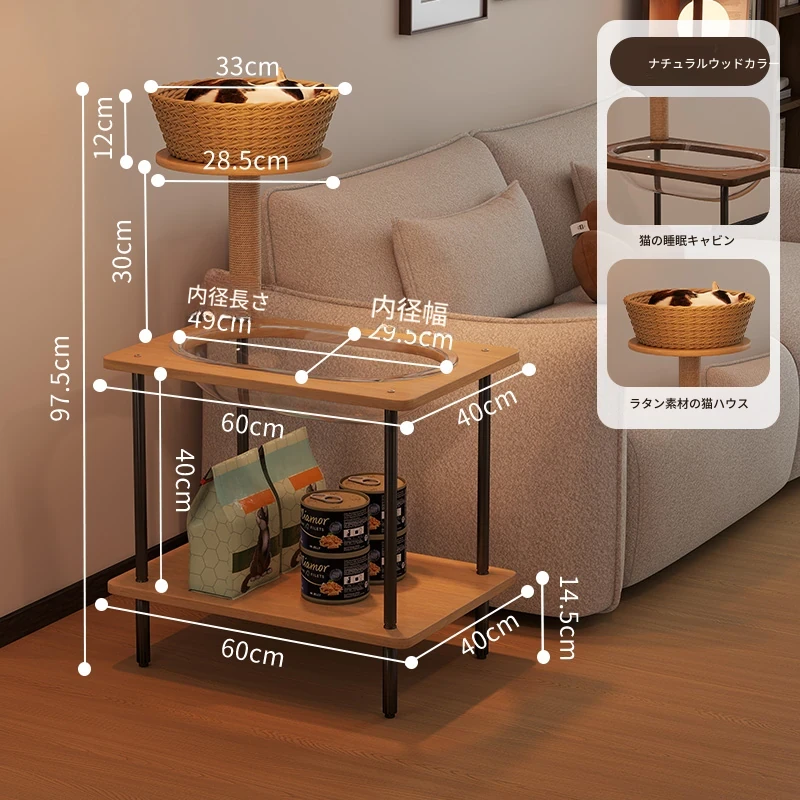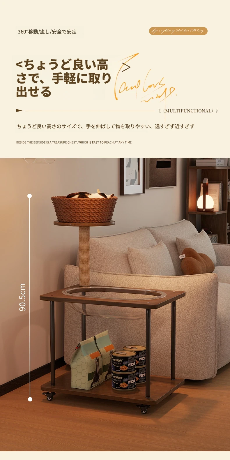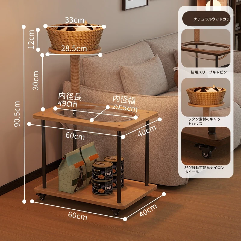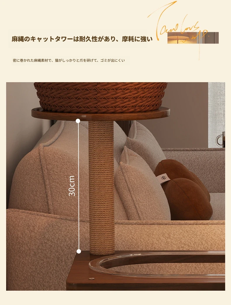 ペットと一緒に使える!コンパクトなサイドテーブル&キャットタワーがセットになった多機能キャットハウス。移動可能なキャビネット付きで、小スペースでも大活躍!猫ちゃんとの楽しい時間をお届けします。