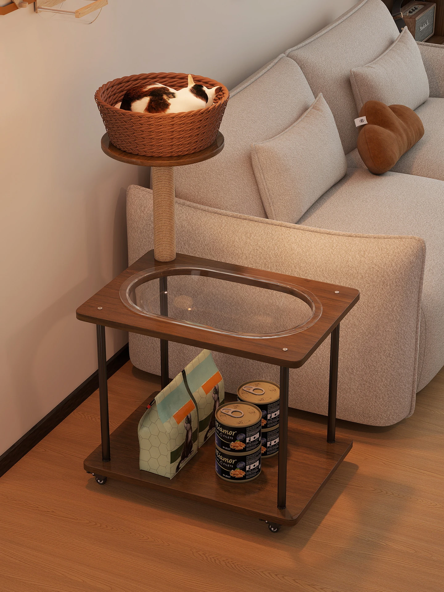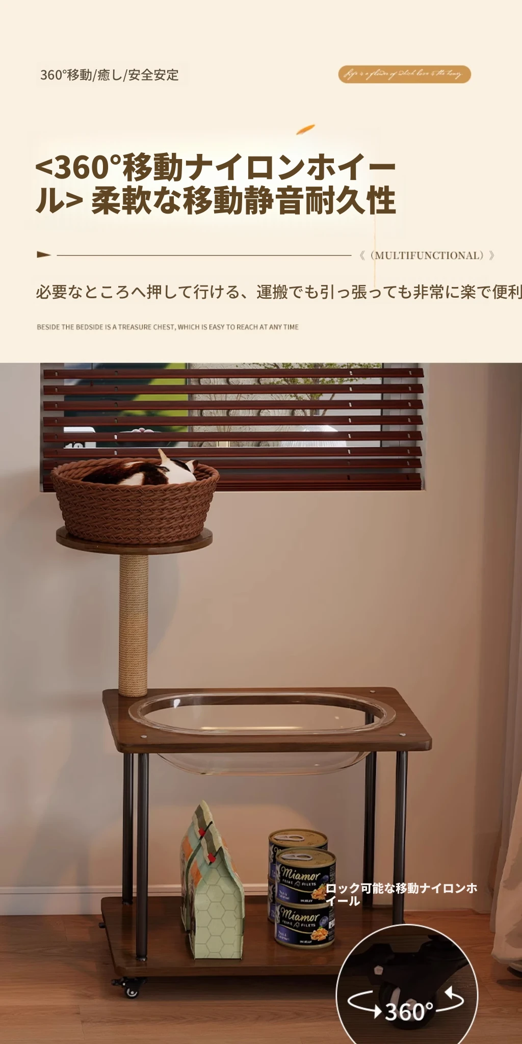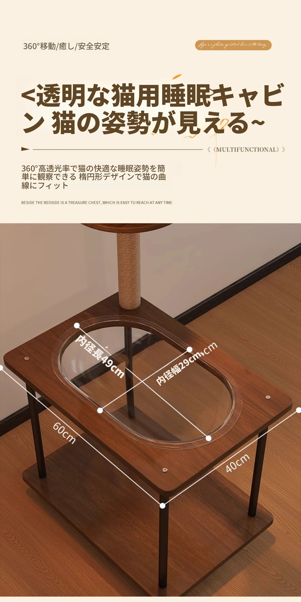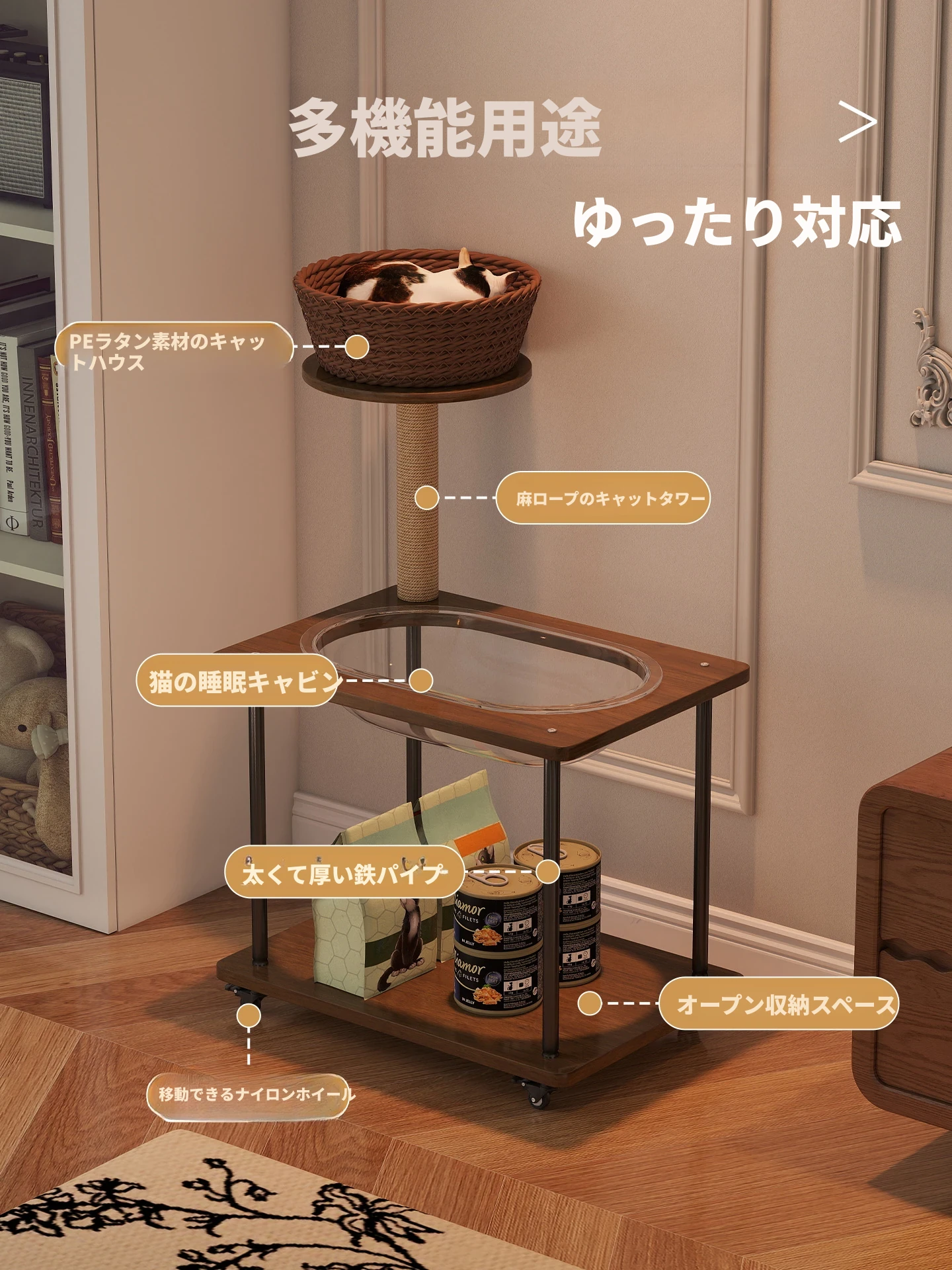 ペットと一緒に使える!コンパクトなサイドテーブル&キャットタワーがセットになった多機能キャットハウス。移動可能なキャビネット付きで、小スペースでも大活躍!猫ちゃんとの楽しい時間をお届けします。