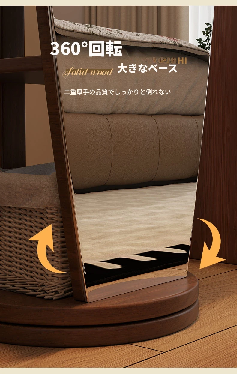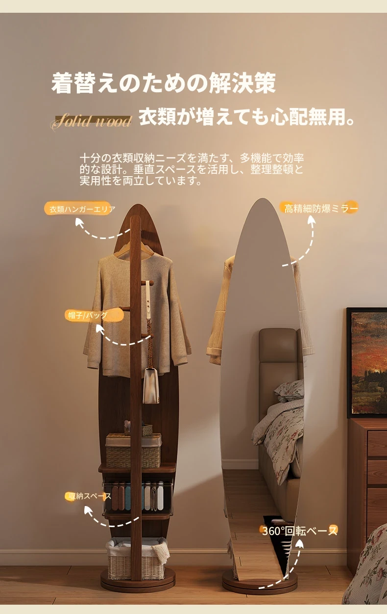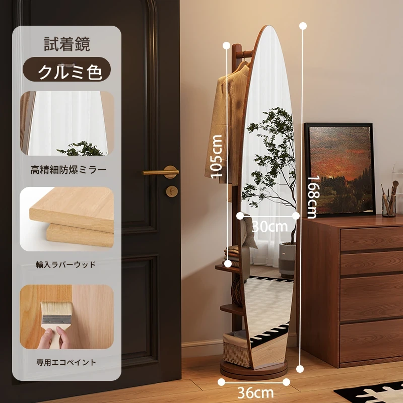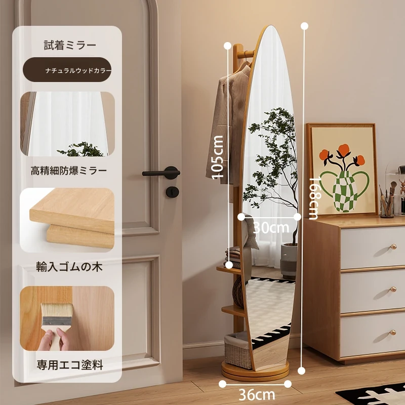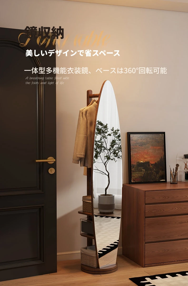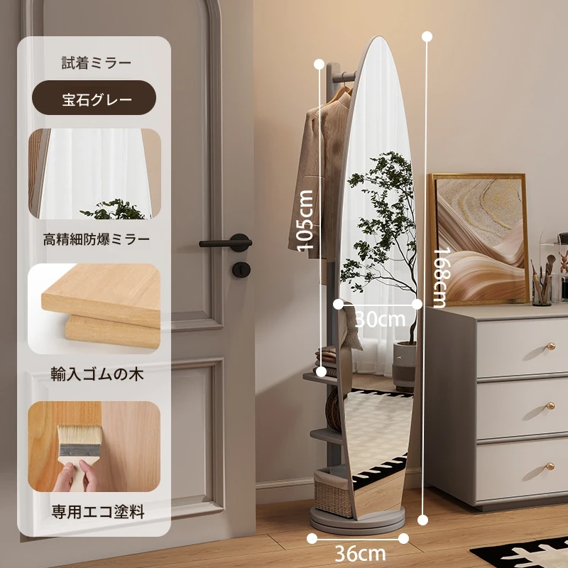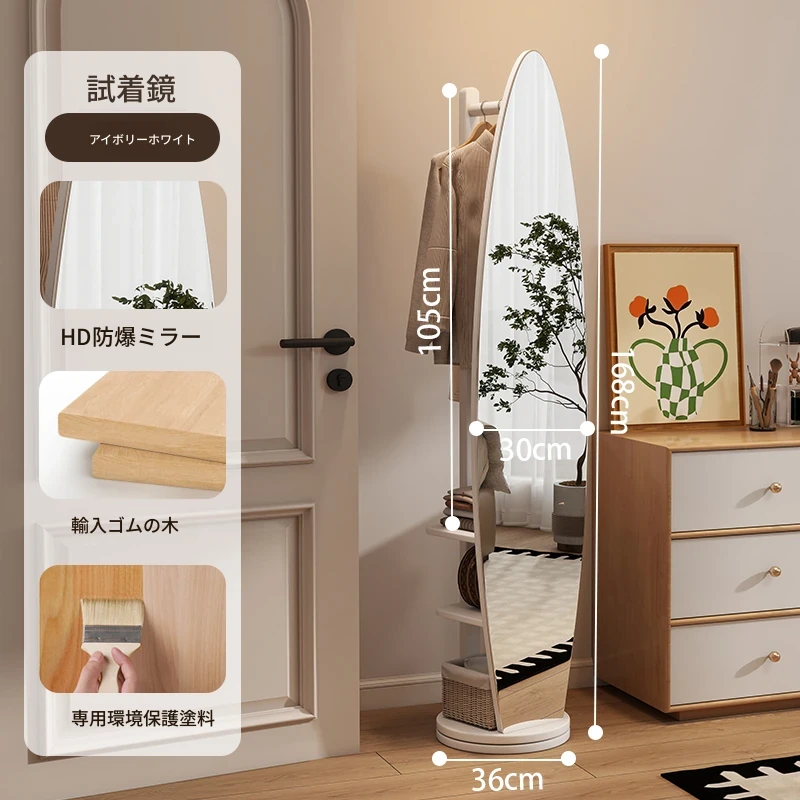 全身鏡スタンドミラー 家庭用寝室多機能試着鏡 回転式ハンガー付き一体型 全身コーディネートミラー