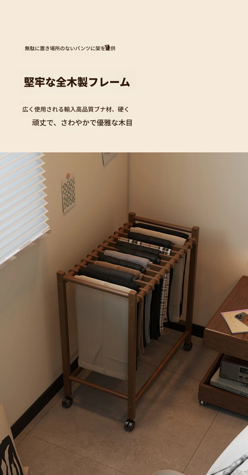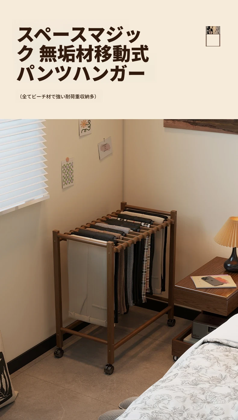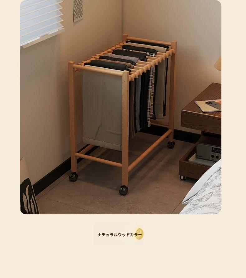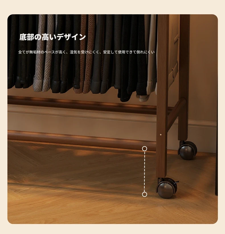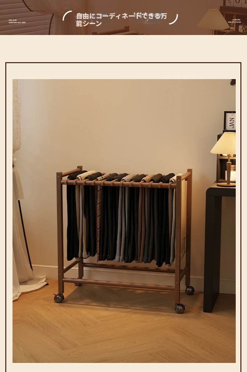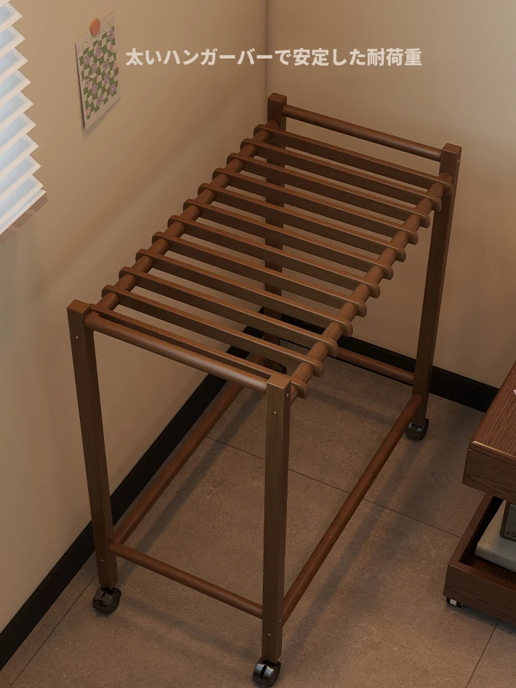 移動式無垢材フロア多機能衣類収納ラック - キャスター付きで使いやすく、衣類もスッキリ整理!自宅での洗濯物干しにも最適な便利アイテム!