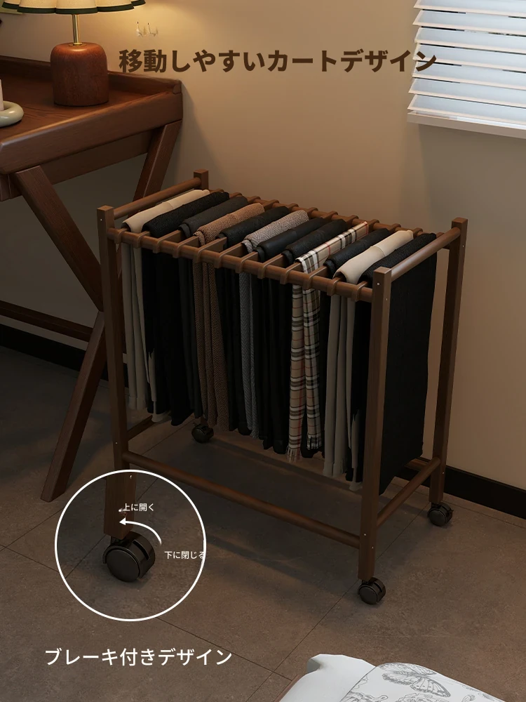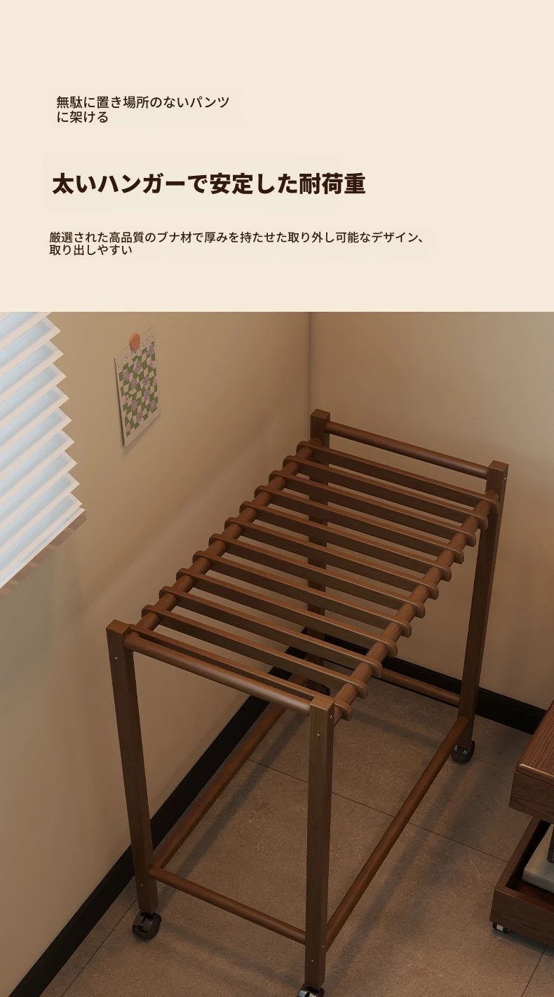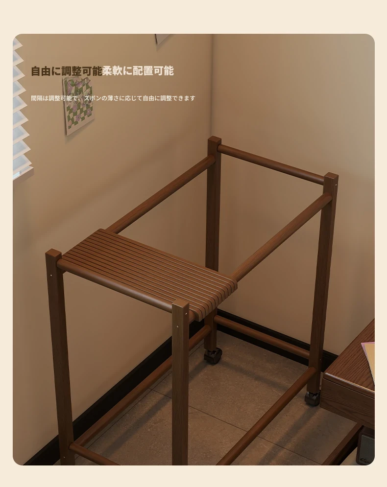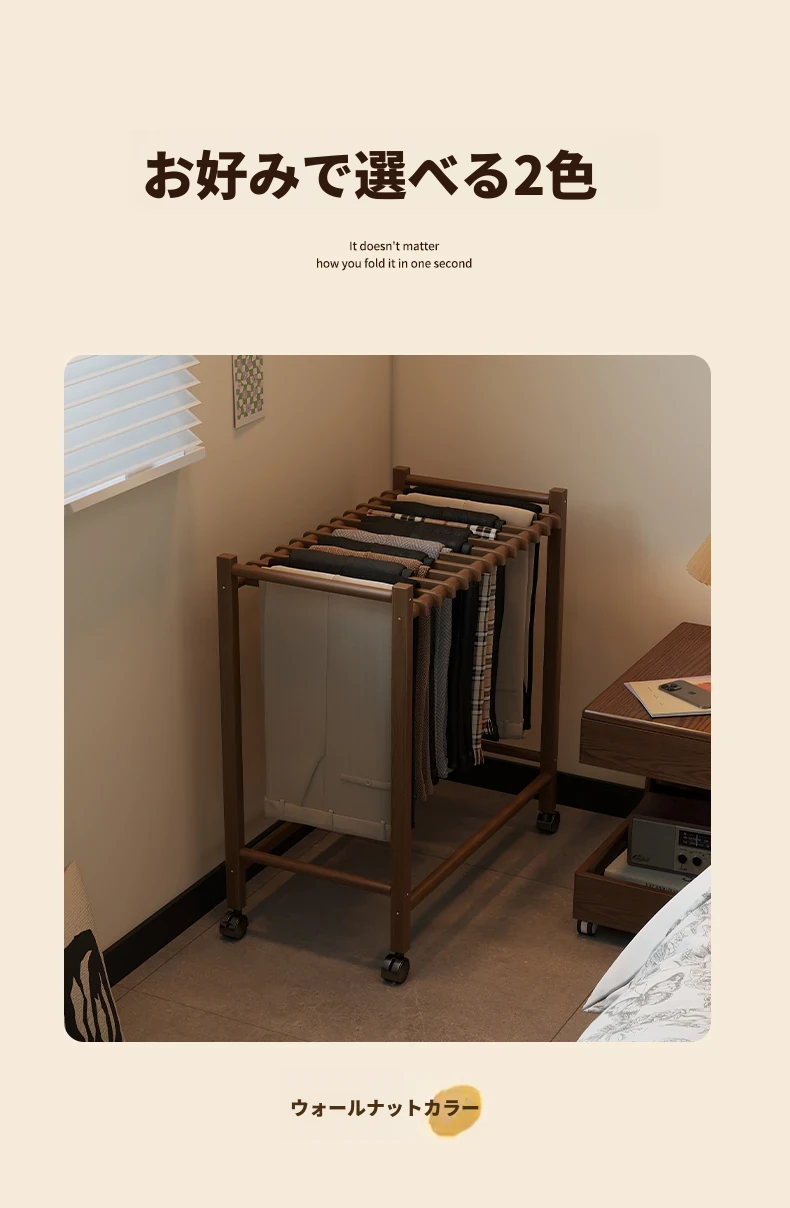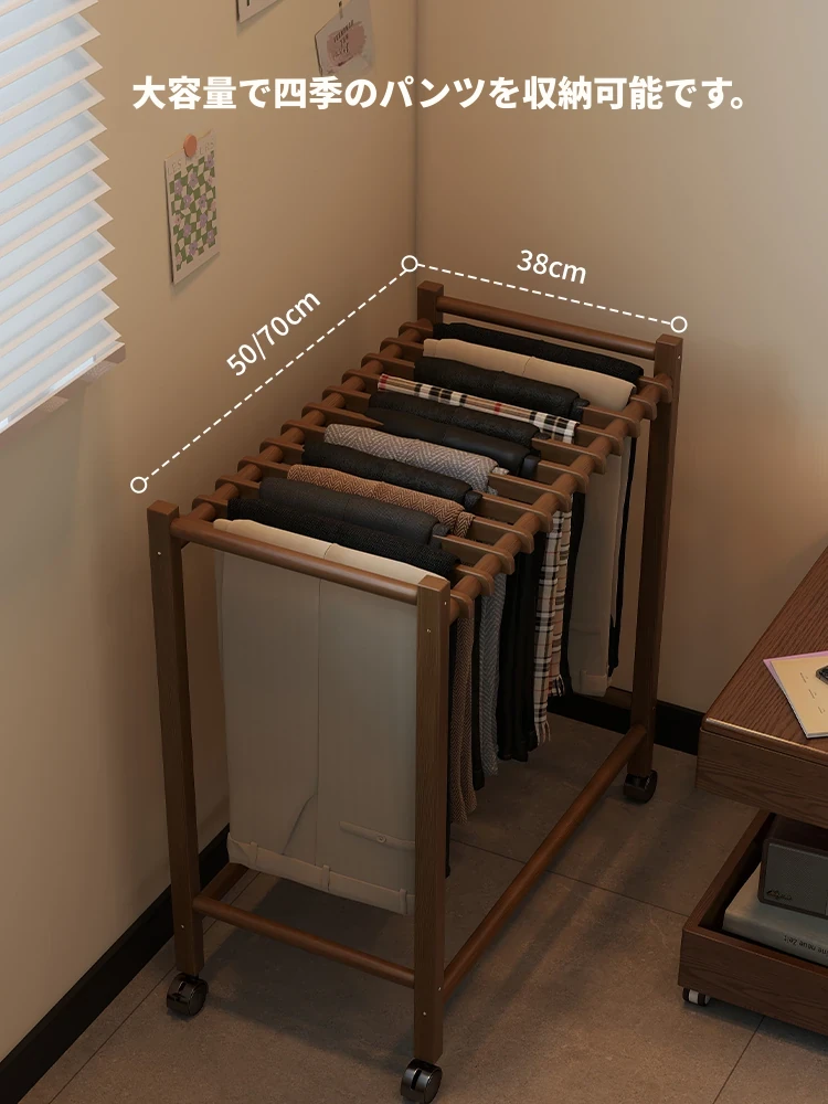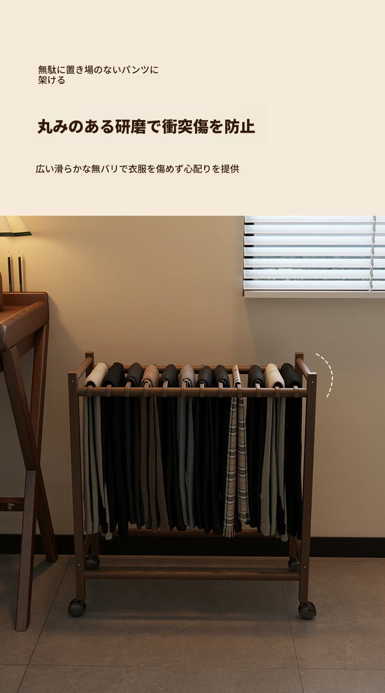 移動式無垢材フロア多機能衣類収納ラック - キャスター付きで使いやすく、衣類もスッキリ整理!自宅での洗濯物干しにも最適な便利アイテム!