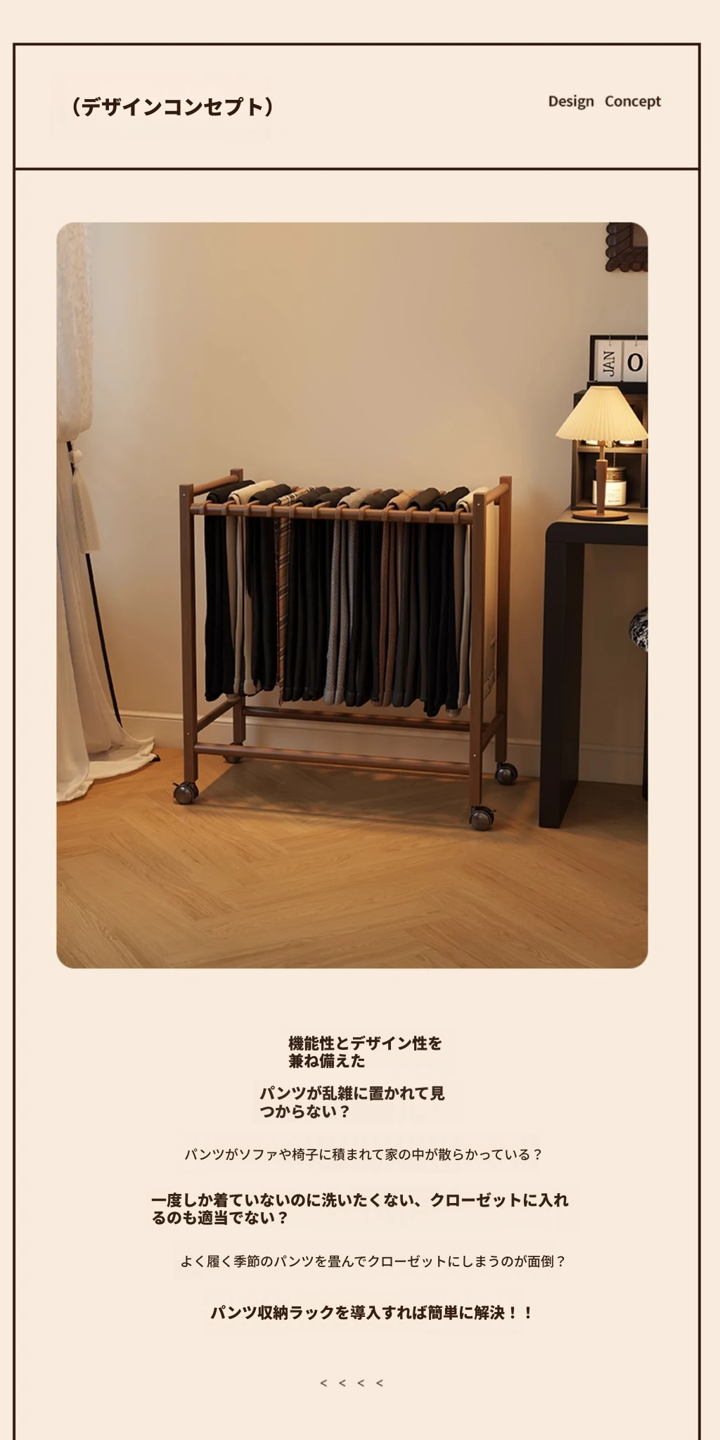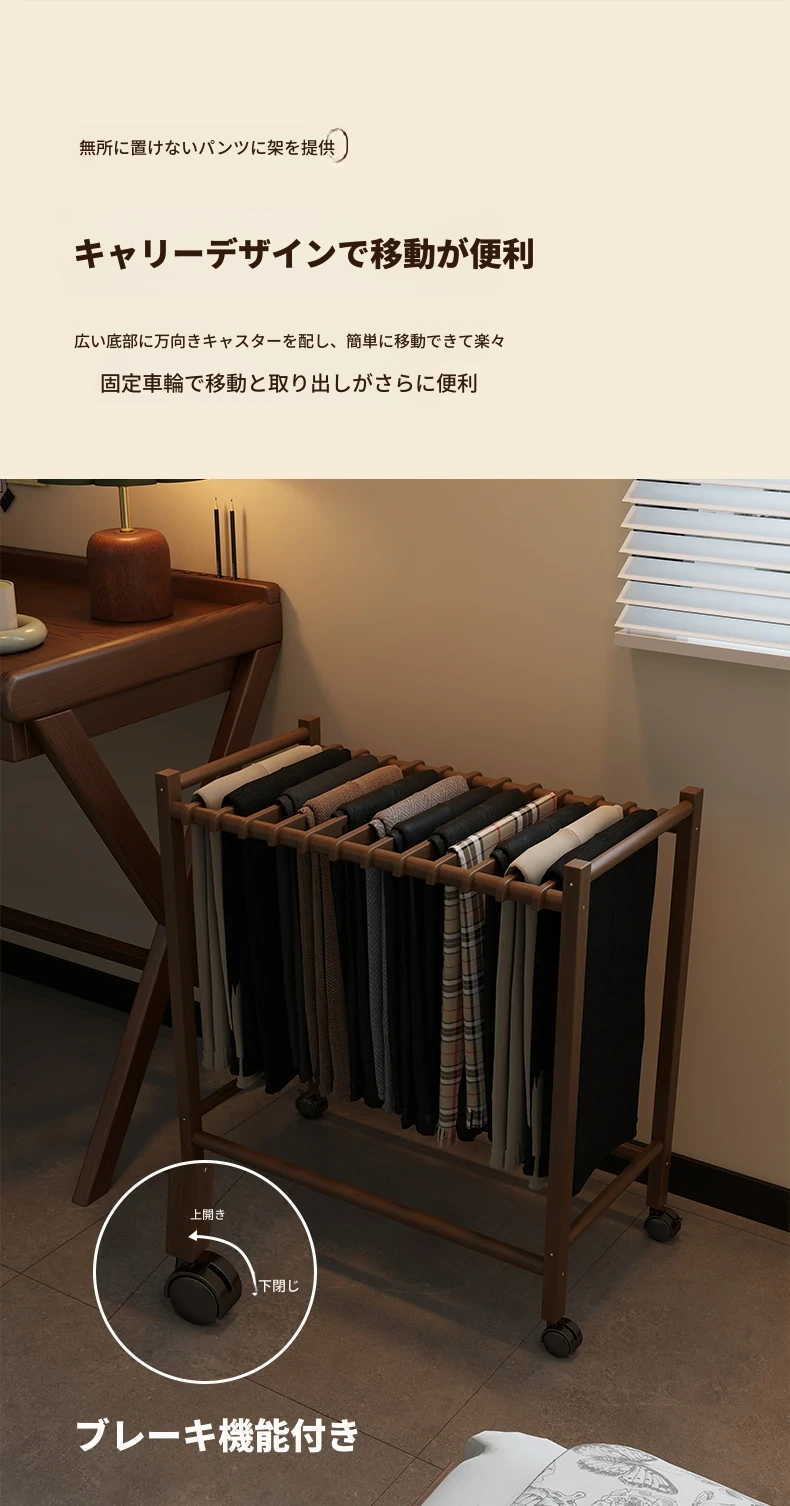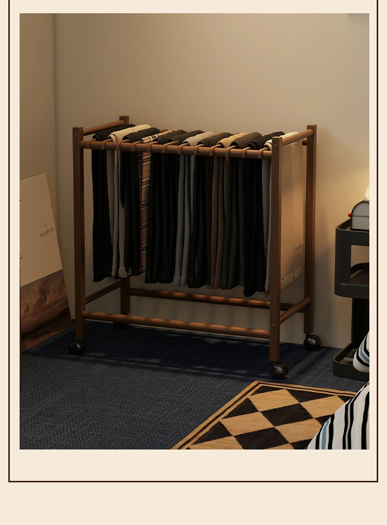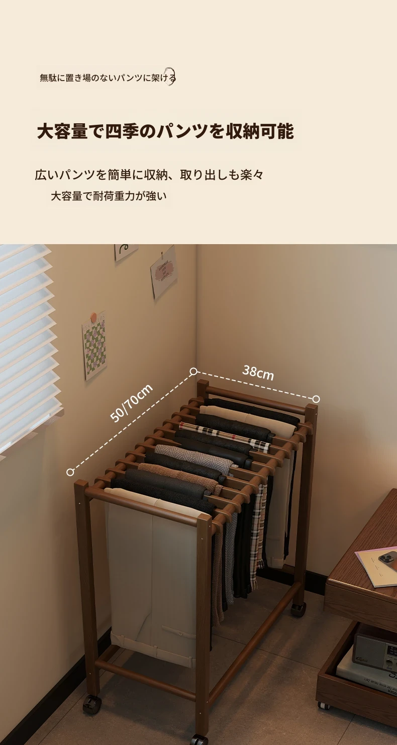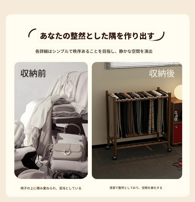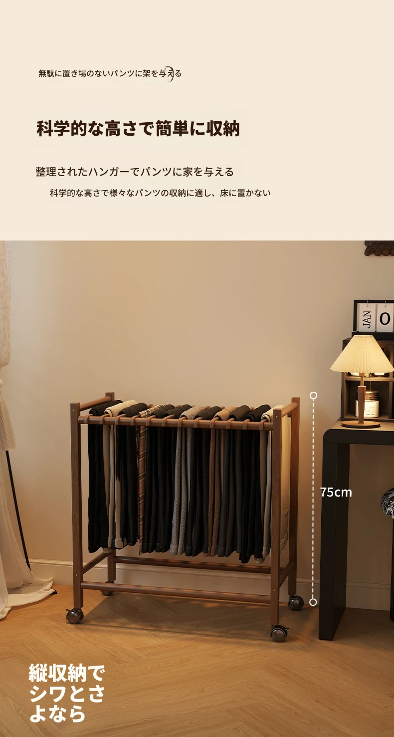移動式無垢材フロア多機能衣類収納ラック - キャスター付きで使いやすく、衣類もスッキリ整理!自宅での洗濯物干しにも最適な便利アイテム!