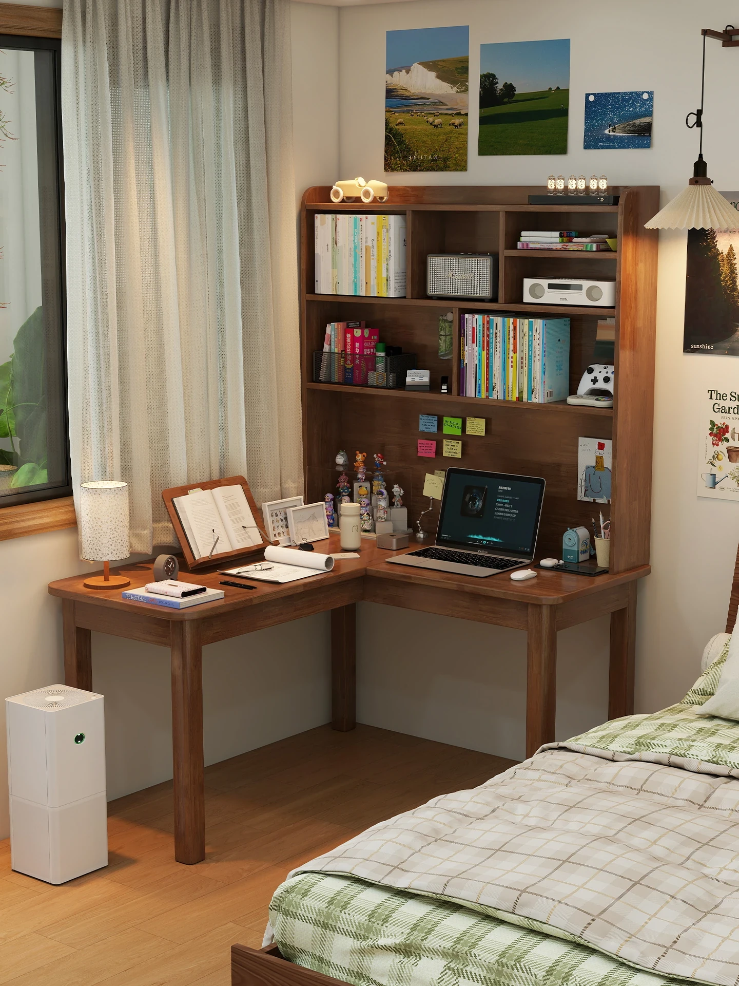 Solid Wood Corner Desk with Bookshelf – Perfect L-Shaped Study Table for Students & Home Use, Ideal Writing Desk for Bedrooms and Small Spaces