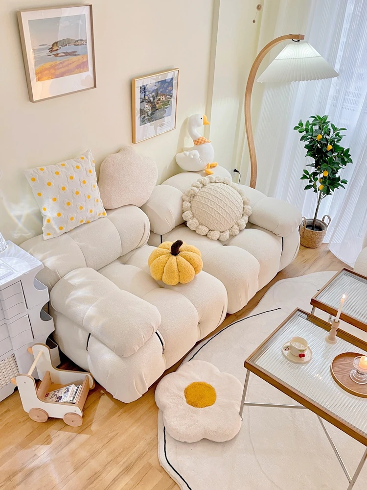 French Cream Velvet Modular Sofa - Modern Minimalist Design for Small Spaces, Cozy 3-Seater Living Room Couch with Lambswool Texture, Trendy and Stylish Tofu Block Shape