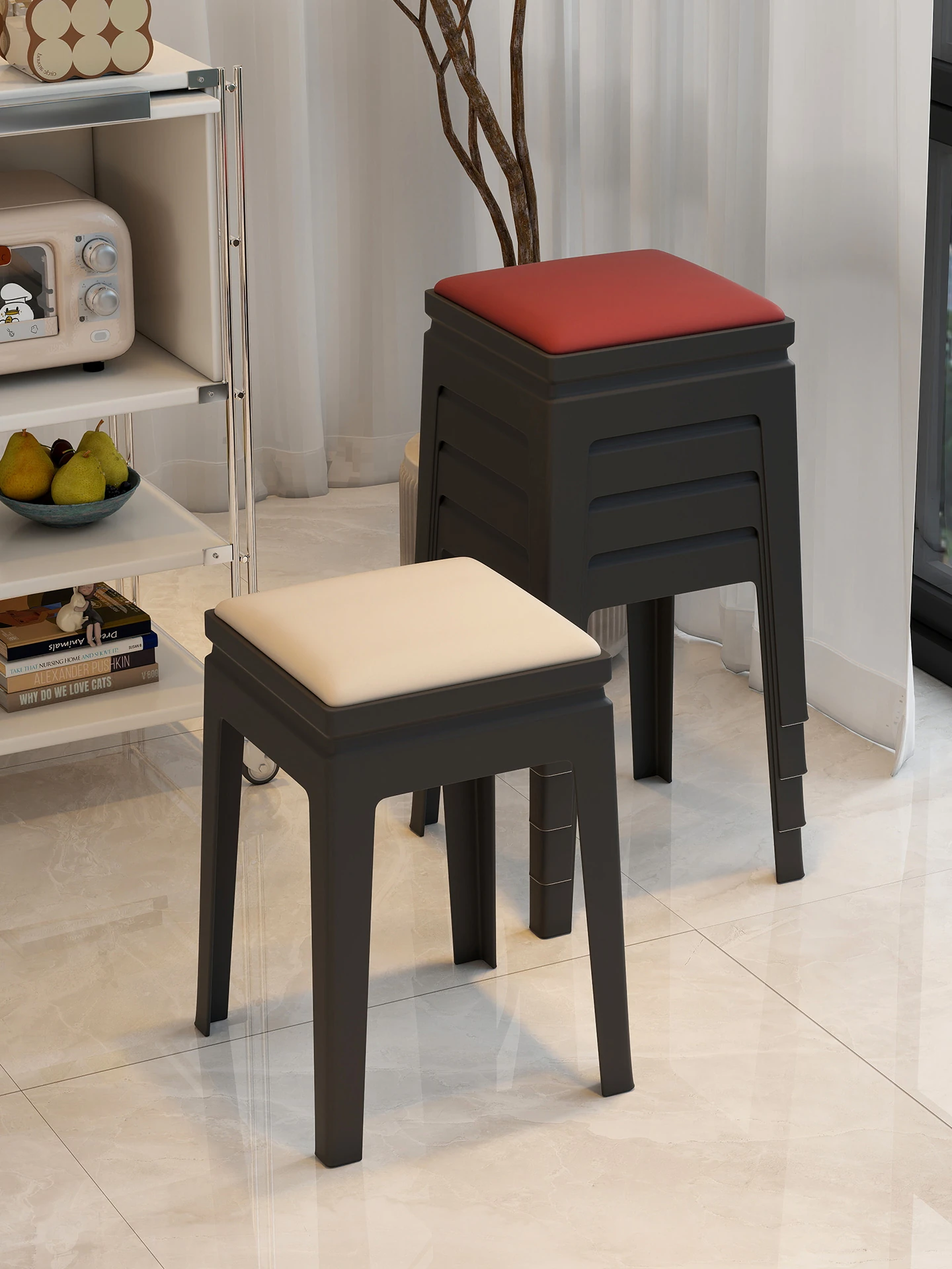 おしゃれで実用的なプラスチックチェア!家庭用のスタッキング可能な厚手ソフトパッド付き四角いベンチ。モダンミニマリズムを取り入れた、リビングやダイニングにぴったりの予備用プラスチック椅子です。