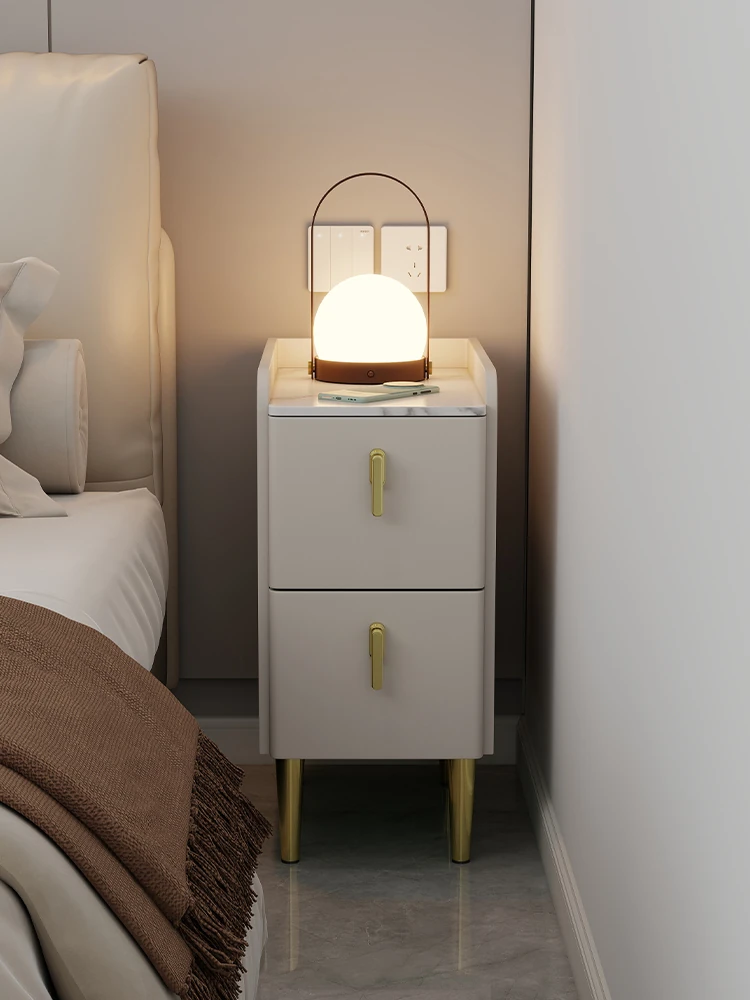 シンプルで洗練されたデザインの無垢材ベッドサイドキャビネット - 超スリムで収納力抜群!現代的な高級感を演出し、寝室をスタイリッシュに彩る岩板仕上げのベッドサイドテーブル。