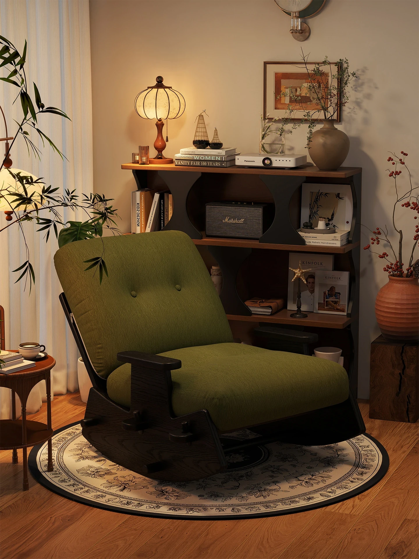 レトロなリラックスロッキングチェア - 大人のためのバルコニー用リクライニング椅子!自宅でくつろげるウッド製ソファチェア。リビングにぴったりな快適なデザインで、心地よいひとときを提供します。