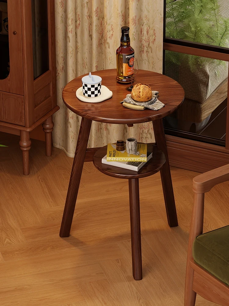 天然木材使用!シンプルでスタイリッシュなリビング用2段小丸テーブル - 家庭用小茶テーブル、寝室のベッドサイドテーブルに最適!温かみのあるデザインで、あなたの生活空間を特別に演出します。