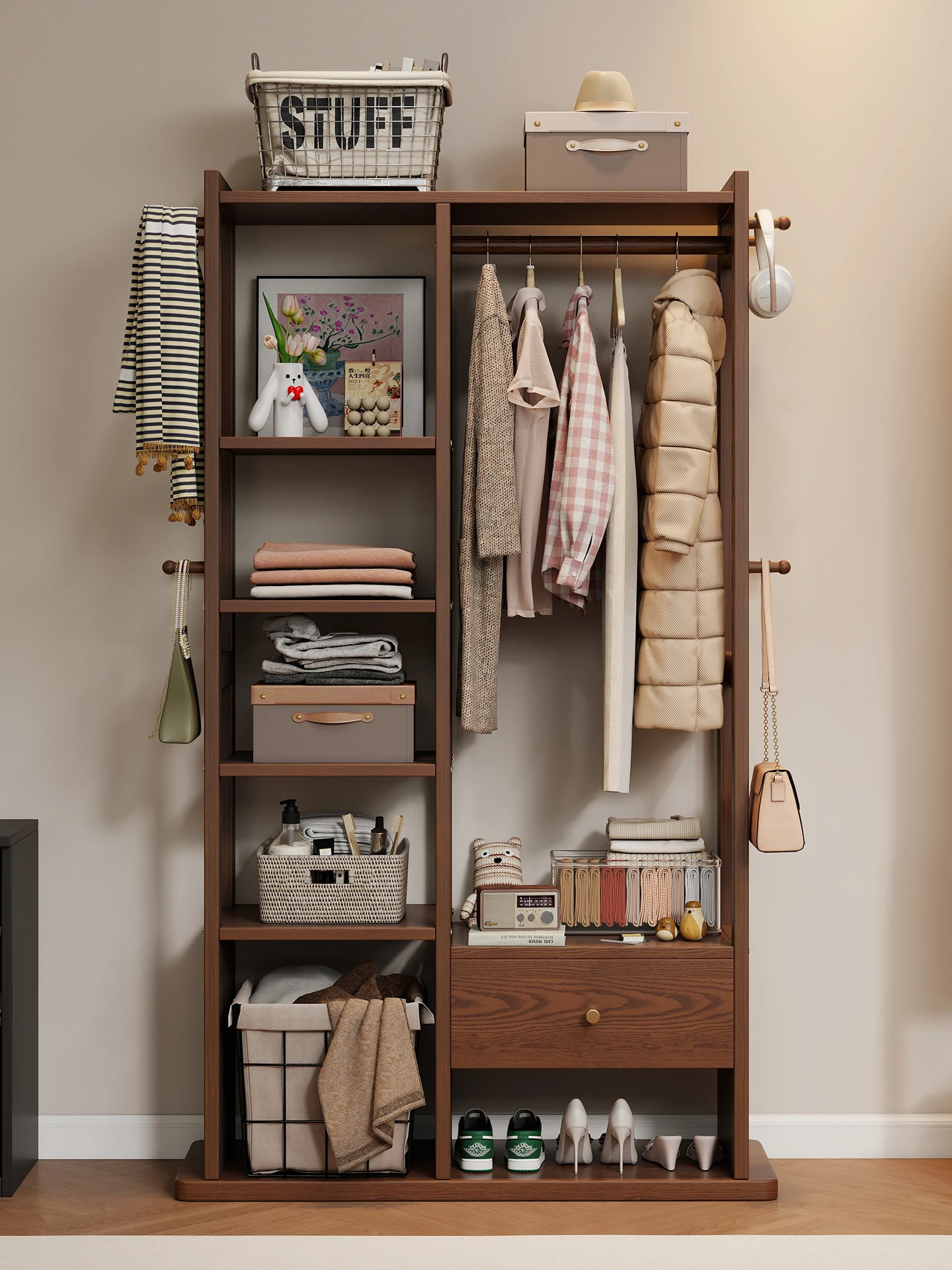 無垢材の衣類ハンガー&ベッドサイドキャビネット一体型収納ラック - 寝室に最適!引き出し付きで便利な収納スペースを提供し、スタイリッシュにお部屋を演出します。